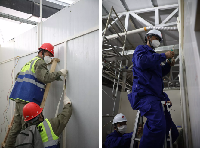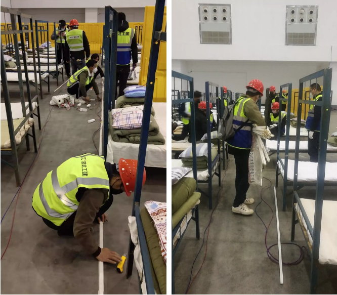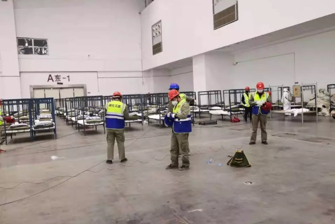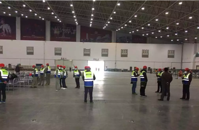 And at 8 a.m. this morning, the HICC commandos had moved to Wuhan Exhibition Hall in the East-west Lake region with only a little rest. At this time, they are building partitions and laying lines in hall A of the exhibition hall and will complete the reconstruction task within today. Have no time to break, the new round of race against time has begun!