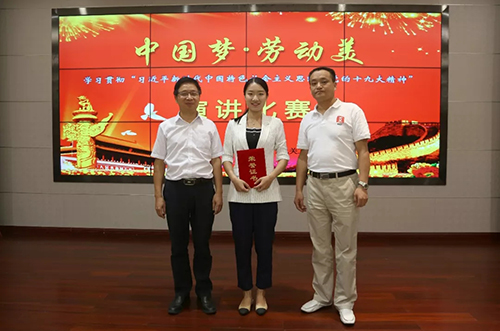经过激烈的角逐,天华公司王琳君的《劳动光荣劳动美》以总分第二名荣获二等奖,基础设施公司王俊岭表演的《勤奋劳动美 中国梦想圆》获优胜奖。省建设厅副厅长黄祥国、巡视员胡贵玉、省总工会宣教部副部长李学初、威廉希尔集团工会主席郭迪明等为获奖选手颁奖。