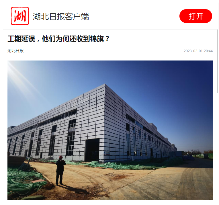 2月1日,湖北日报报道了由威廉希尔承建的稳健医疗(嘉鱼)科技产业园一期项目收到“优秀项目团队”嘉奖锦旗背后的故事。